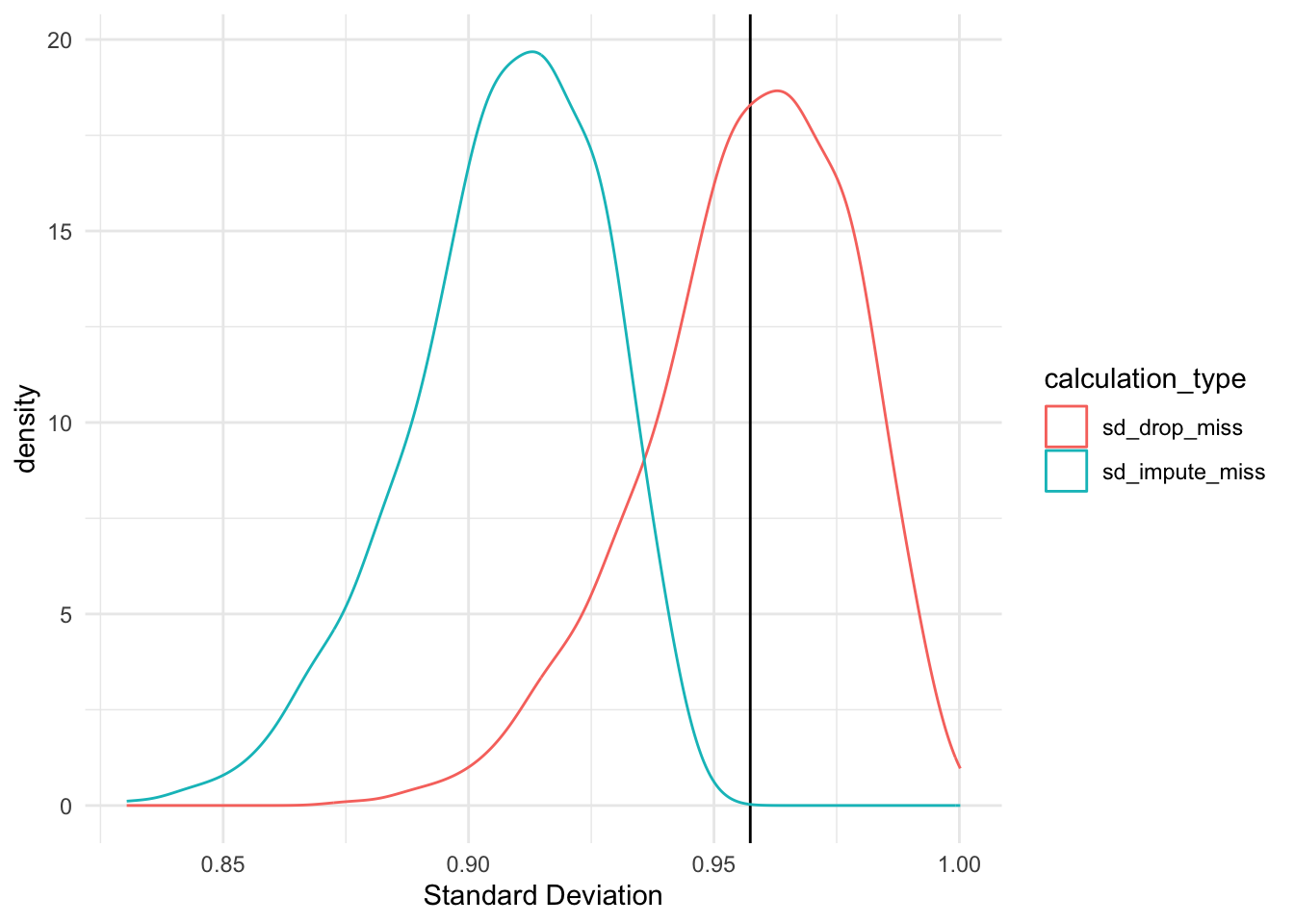 As the figure above shows, there is a significant difference in the standard deviation estimates when calculated using only observed values and calculated with missing values imputed with the mean. The t-test below confirms this.